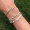 single gold beaded bracelet | 14k gold filled beads | 4mm beads with 10mm disc | hand stamped single initial | strung on high quality elastic string