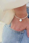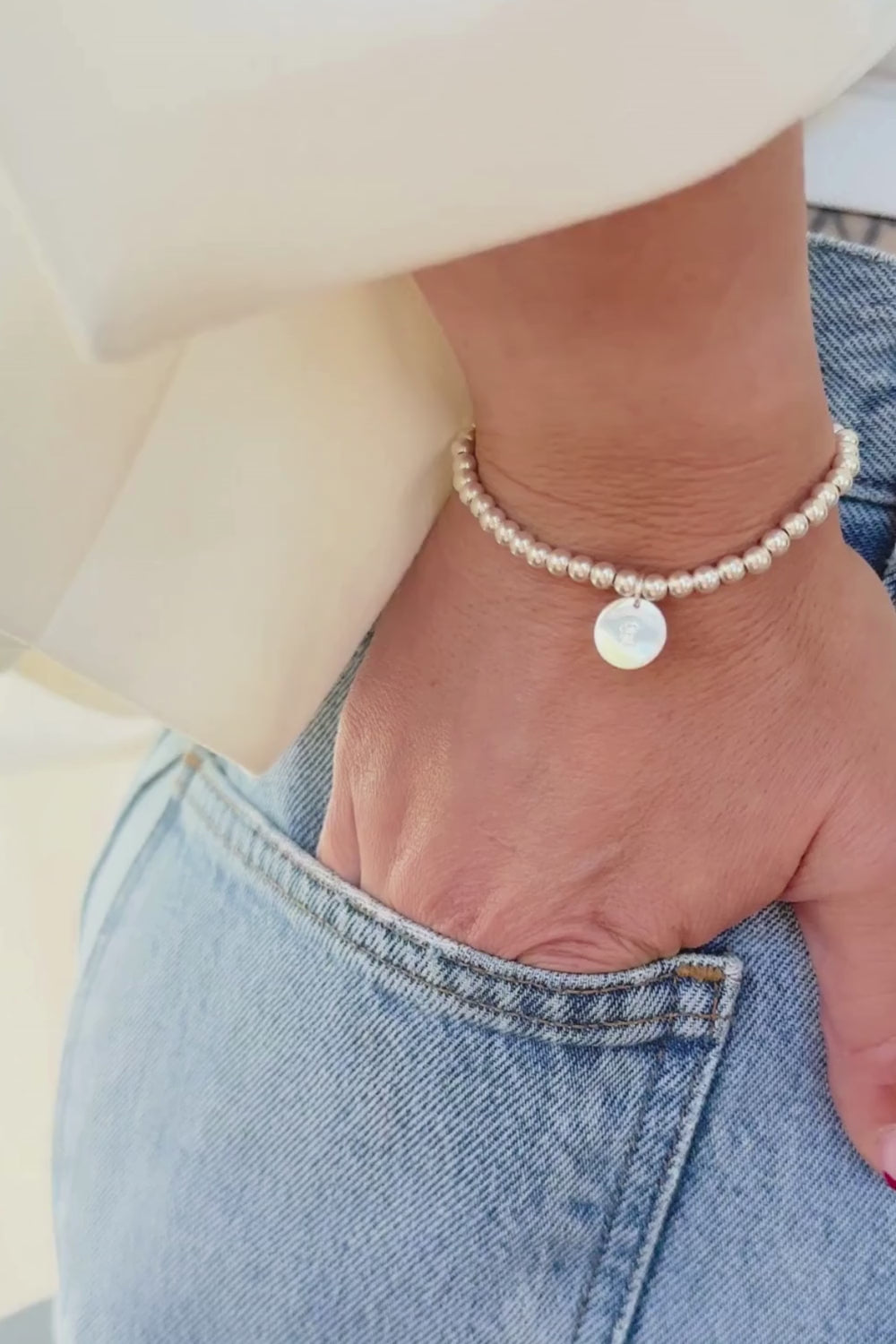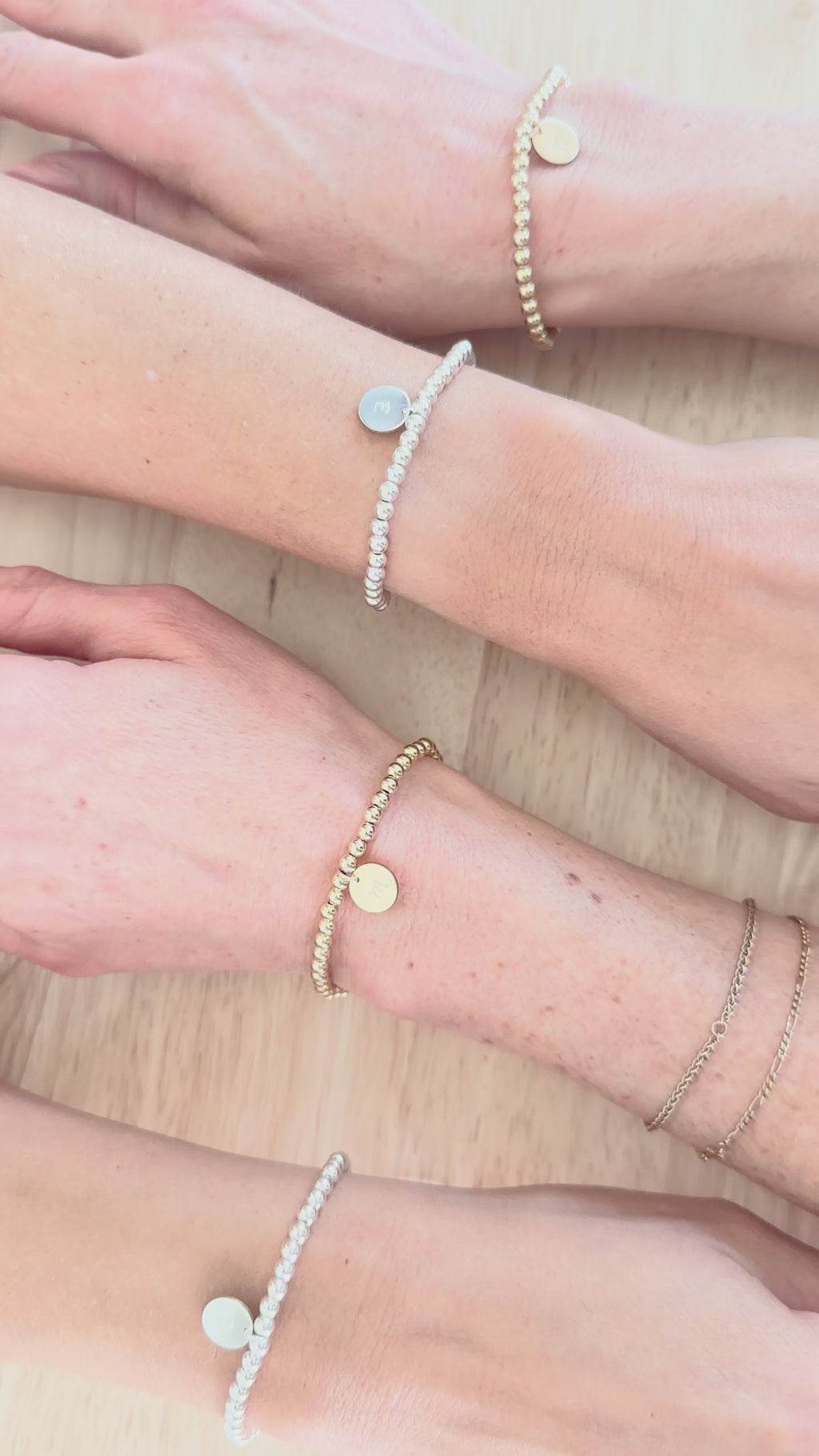 single bracelet | 4mm beads with 10mm sterling silver disc | hand stamped single initial | strung on high quality elastic cord